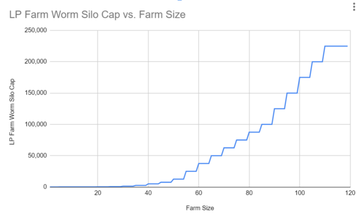 <figure><img src="https://3677132957-files.gitbook.io/~/files/v0/b/gitbook-x-prod.appspot.com/o/spaces%2FF8OuqlG4SiJ3bLJ9JiW1%2Fuploads%2FElK13z9S2HmiWrCSuQfh%2F0%20EtTo8z56OsdbHkKL.png?alt=media&#x26;token=a2b4b0ca-3ce5-4d95-b9b2-3c41a7442cc0" alt=""><figcaption><p>The Silo cap for $WORM plotted against FarmLand bigness. Note that the actual cap is directly derrived from a formula involving Wormcount, which itself is calculated from FarmLand bigness.</p></figcaption></figure>